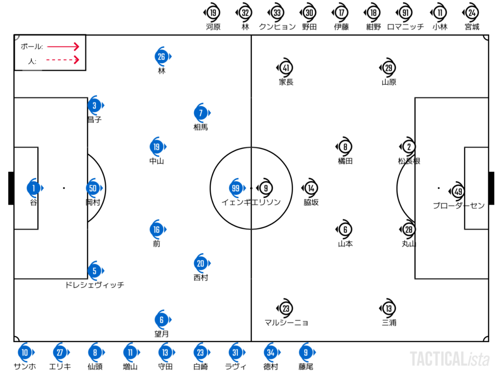 もう1つの陣地回復の安定感は微妙なところ。1トップのイェンギはポストプレーではボールを収めることができる一方で、低い位置から単独で強引に陣地回復をするような推進力を出すのは難しい。左の相馬やサンホといった面々が前を向くことができれば敵陣にスピード感を持って迫っていくことができるものの、そうした状況を作り出すためのルートはそこまで多くはない。