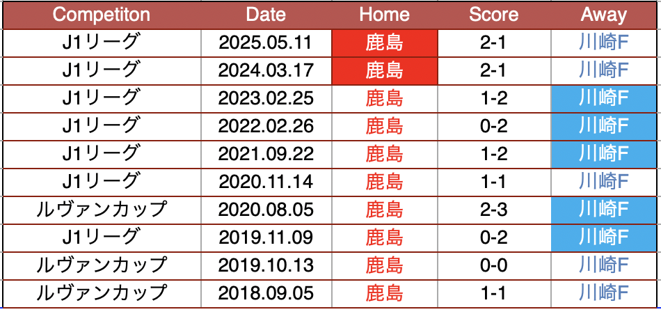 直近5年間の対戦で鹿島の3勝、川崎の10勝。