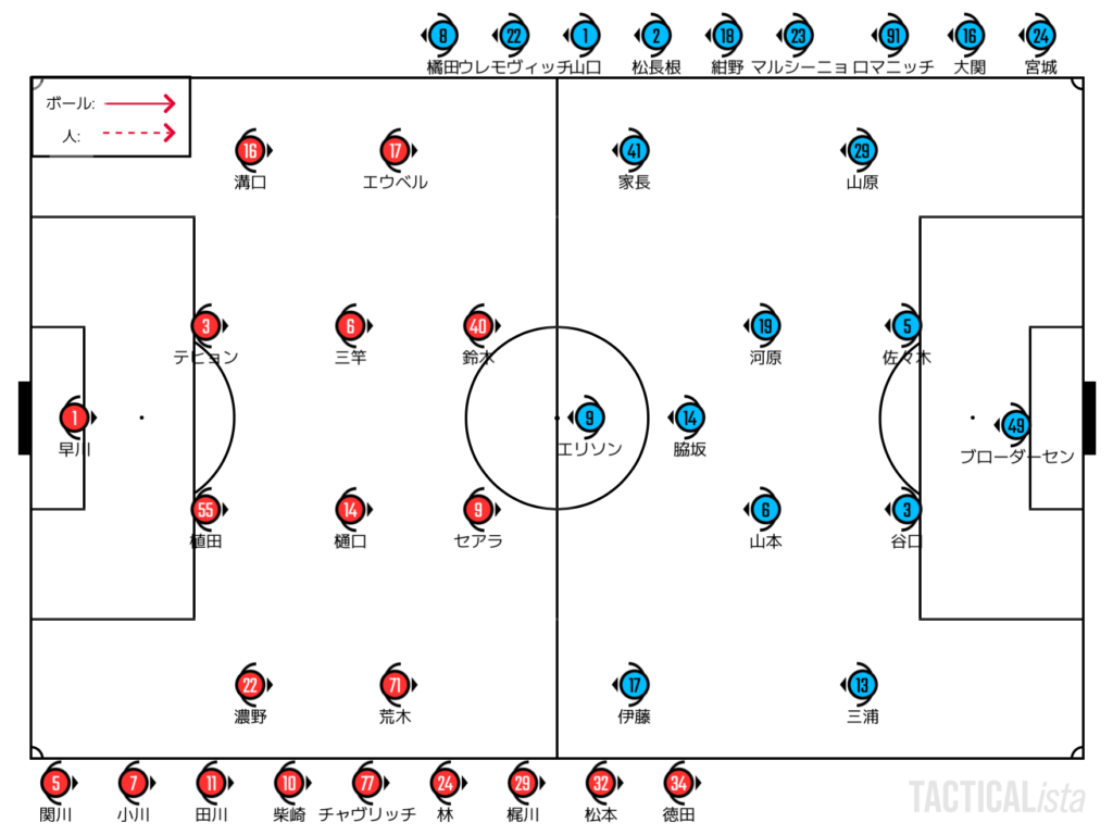 保持においてはGKの早川を積極的に使っていきたい意向とのことで、これは配信の放送席での言及もされていたし、実際にプレーを見ても同様の感想を持った。プレスに対してまずは早川に持たせて、各ポジションの動きを確認するかのような時間が生まれていた。