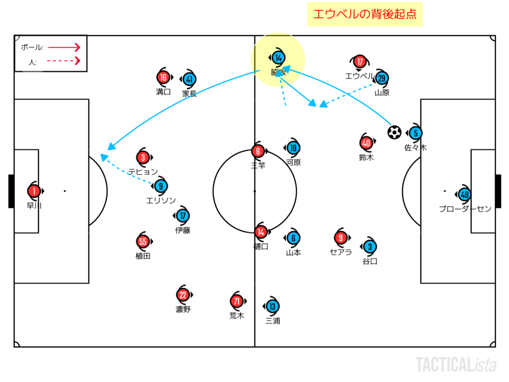 保持の機会を生かしながら、相手のハイプレスに対して真っ向勝負するという線もなくはない。狙い目になるのは前がかりになりやすいエウベルの背後。SH-SB間のスペースは空きやすく、微妙に誰が出てくるかも見えてこないので、CHやトップ下が流れていくような形でボールを受けるのは面白いかもしれない。