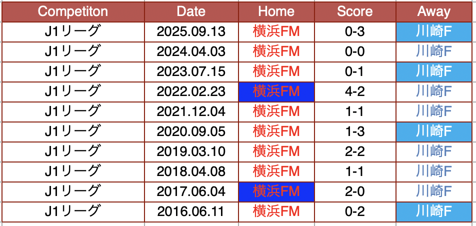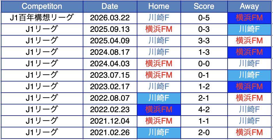 直近5年間の対戦で横浜FMの4勝、川崎の4勝、引き分けが3つ。