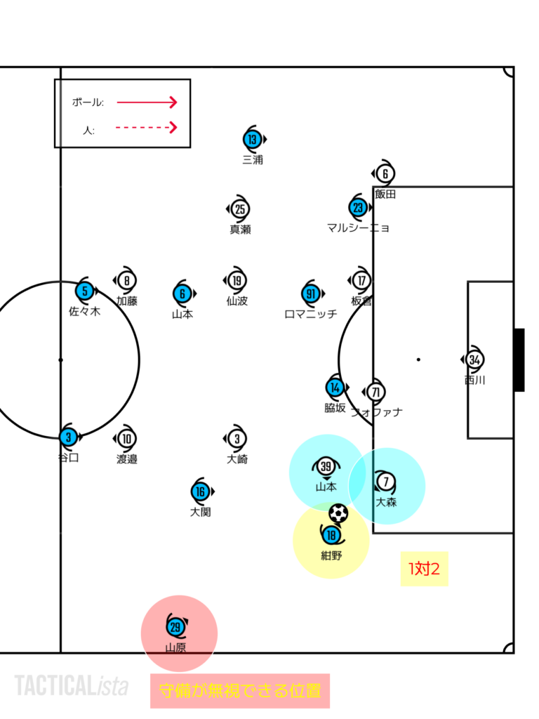 この山原は紺野から見れば死角。パスコースを作っているわけでもない。もちろんボールを受ければクロスを上げることはできるだろう。ただ、川崎はインサイドに高さがあるチームでもクロスの入り方にうまさがあるチームでもない。大外レーンから上がってくるであろうロブ性のクロスは相手のDFからすれば比較的対応しやすいボールだろう。