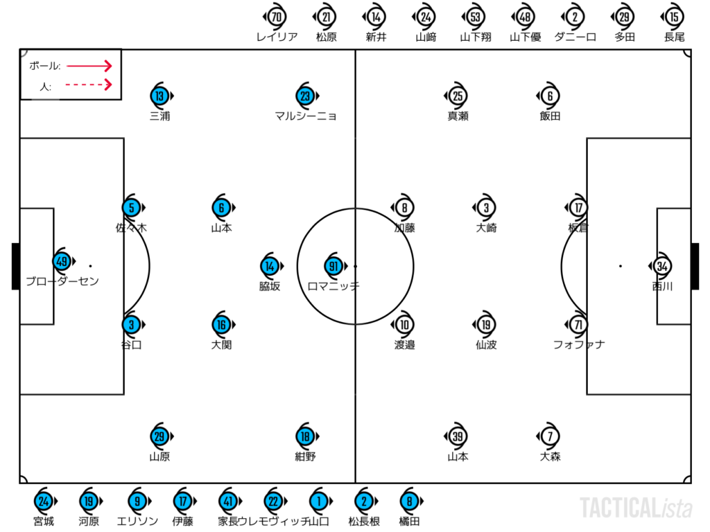 前節に比べてCHは脇坂とともに3CH気味に組み立ての貢献度を増していた一方で、ブローダーセンは組み込みにくさがある。ショートパスでリスクがあるプレーを排除し、基本的にはロングキックを選択。そのロングキックに関しても精度が足らず、ロマニッチに届かないこともしばしば。CFの収めるスキルとは別のところで機能性が下がることもあった。