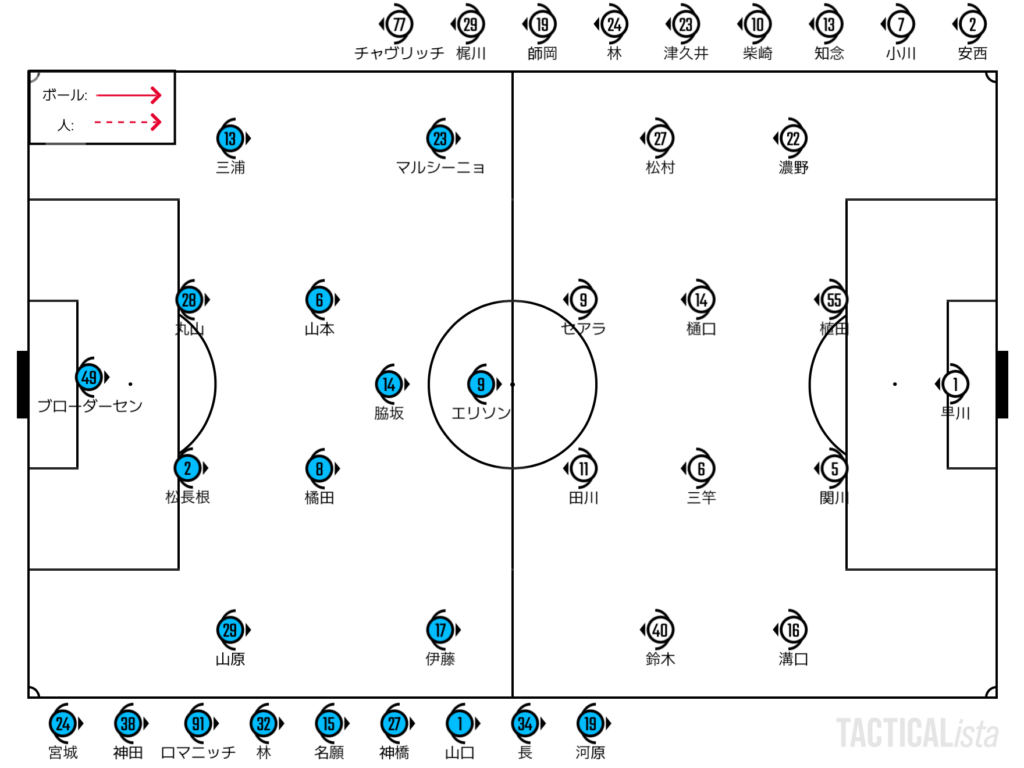 ブローダーセンからつなぐことができれば問題なく前進ができそうな川崎。しかしながら、その余裕がなかった時には苦しくなってしまう。ロングキックに逃げた時はブローダーセンは精度不足でなかなか味方にボールを届けることができず、エリソンも競り勝つことができなかった。