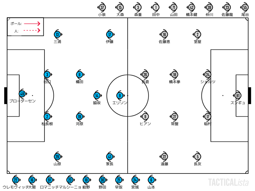 降りるアクションが多い長倉やヒアンも含めて川崎のCH周辺に負荷をかける動きが多かったのは確か。この動きも川崎がハイプレスに出ていく際の牽制になっている。