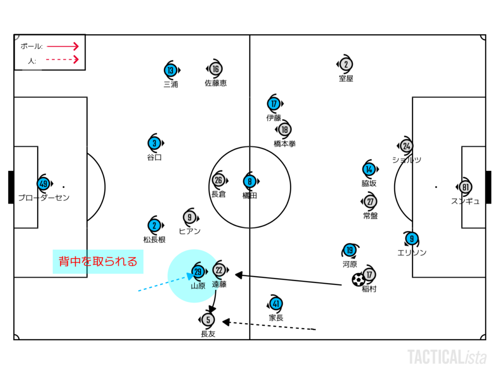立ち上がり3分のシーンでは稲村が1枚マークを外したところに河原が縦の誘導をかけていくが、縦パスの受け手へのチェックが間に合わなかった。山原が本来は咎める役割だが、仮に強く当たったとしても、ワンタッチで家長の背後に走り込んだ長友に叩かれる未来が見えていたのだろう。