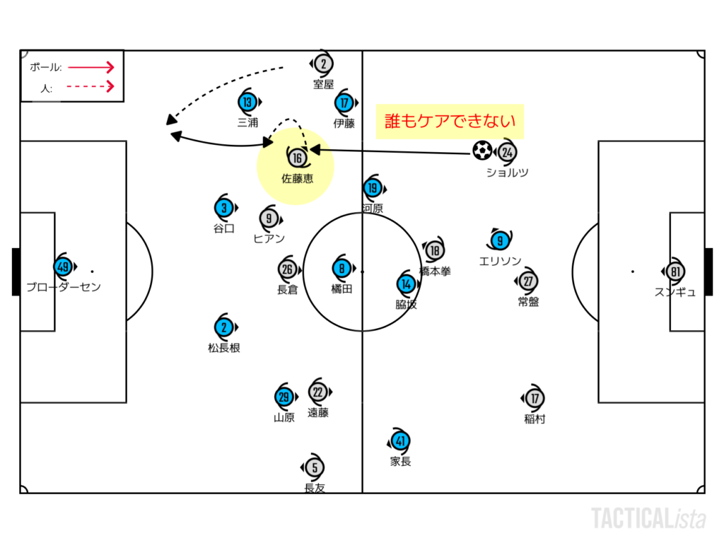 前から誘導できていないのはわかるが、後方のブロックもやはり危険なスペースを優先して消せていないのは気になるところだ。7分、ライン間のハーフスペースで反転した佐藤が、裏を取る室屋にパスをつけたシーンはやはり見過ごせない。