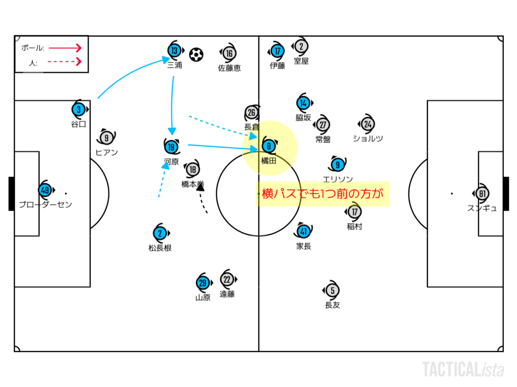 この場面では三浦の対面の佐藤が縦方向にパスが出るよう誘導していたが、横にパスが出る場合でも橘田は縦に抜けて問題ないだろう。橘田と河原は同一線上にいるので、2人いることで三浦の選択肢は増えない。それであれば橘田は高い位置を取り、河原のスペースを開けつつ1列前の選択肢を作りたい。