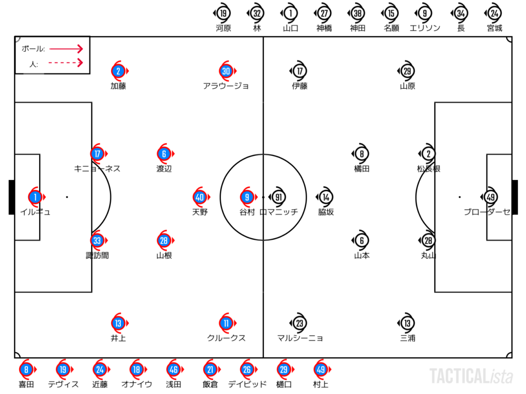 左サイドでは例のパスのせいか早々に退いたマルシーニョの代わりとなった宮城がチャンスメイク。個人的にはロマニッチがサイドに流れた時のストライカー役として面白いのかなと思ったが、位置交換からの侵入(初期配置が入れ替わっていたことはあった)から入っていくシーンはあまり見られなかった。