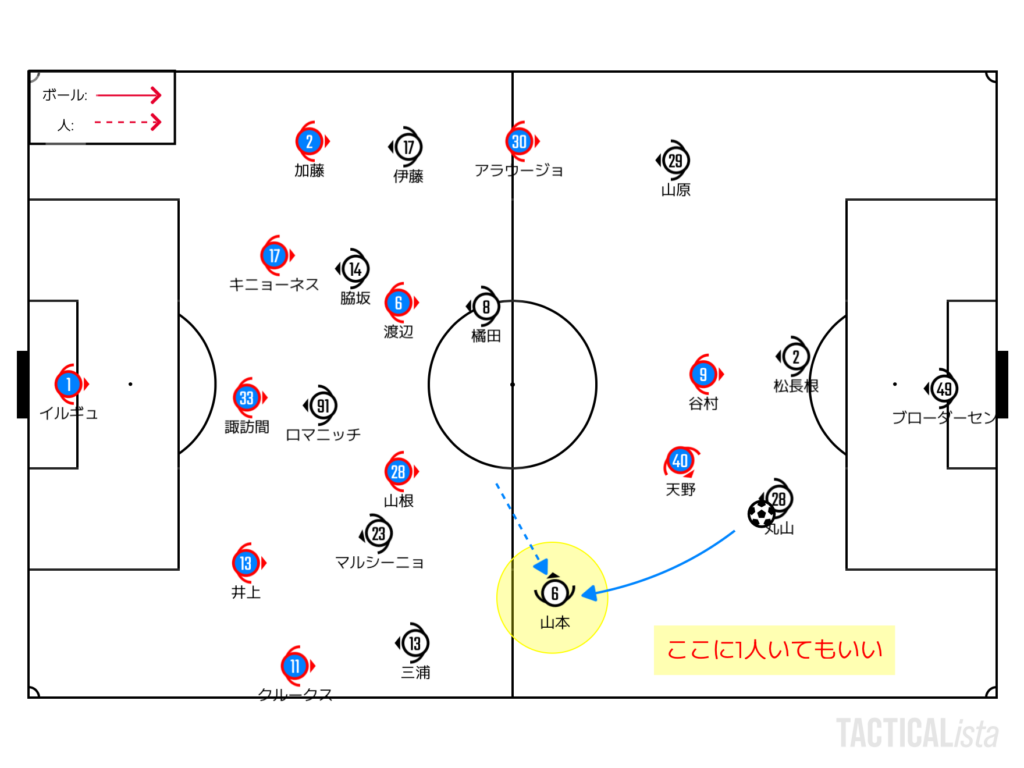 普段であれば降りるアクションを見せないマルシーニョも中盤にボールを落ち着かせに降りてくる。前半の最後にしっぺ返しが来るのだけども、そのしっぺ返しまでは降りて受けるアクションは効果的に活用する事ができていた。