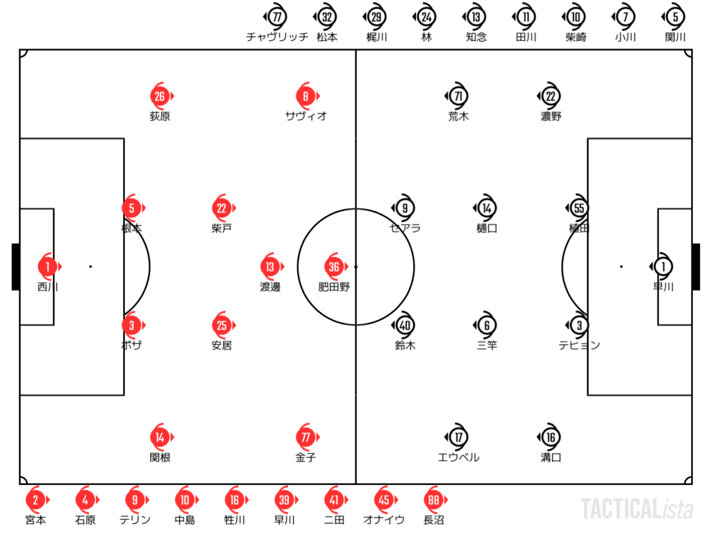 2-2となり、試合はオープンな展開に。鹿島は一気に畳み掛けたいところだが、この時間帯はサヴィオの細かいテクニックが鹿島の寄せを上回っている時間帯。浦和は勝負をかけたいところだが、テリンがターゲット役としてもプレス役としてもイマイチ刺さらなかったのは誤算だった。