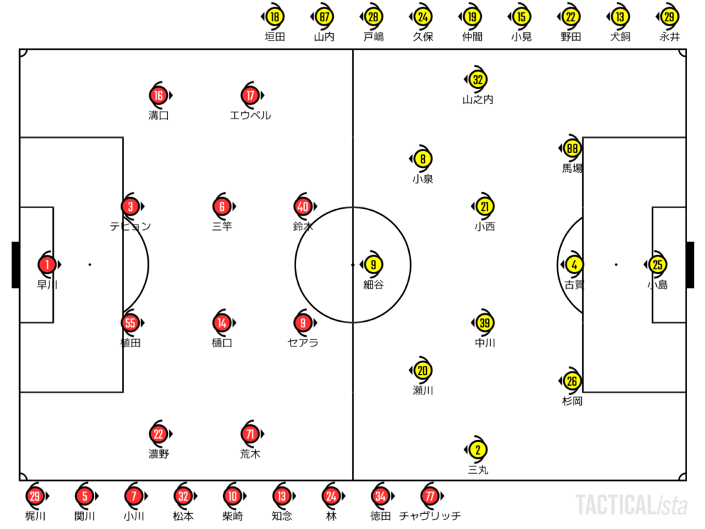 狭いスペースを横断したところから小見は決定機を迎えたが、このシュートはGKの正面に。その後に山内のシュートも正面を突くなど早川を慌てさせるフィニッシュを打つことができない。