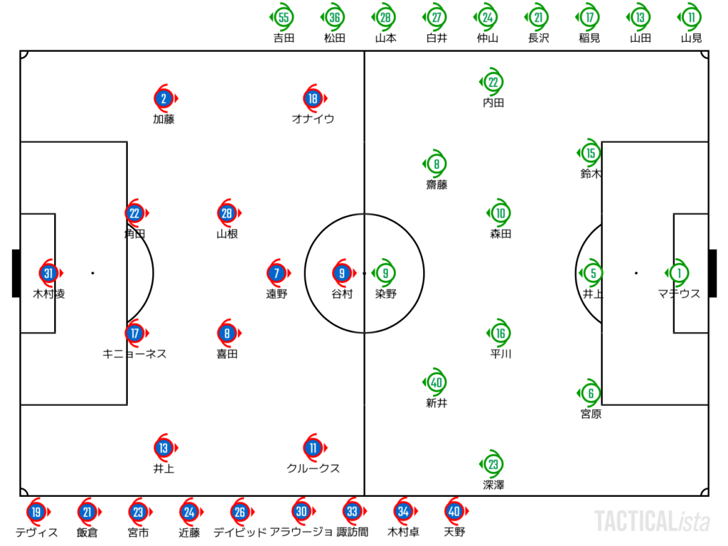 時間の経過とともに東京Vの前進の手段は染野に依存していくように。キニョーネスとのマッチアップは非常に見応えがあった。しかしながら、CF-CBのマッチアップで試合の流れに変化を与えたのは谷村。井上と競り合いながらPKを獲得。だが長いOFRの末、これは先に谷村のファウルを取られるという判定に変更された。