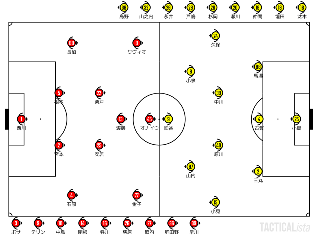 保持でプラス1を作りながら相手の中盤の背後を取れるようになった柏は、少しずつ前進に手応え。浦和は前の6枚のプレス誘導が中途半端で、三丸がフリーなポジションを取る柏の左サイドにはかなりかく乱されていた。