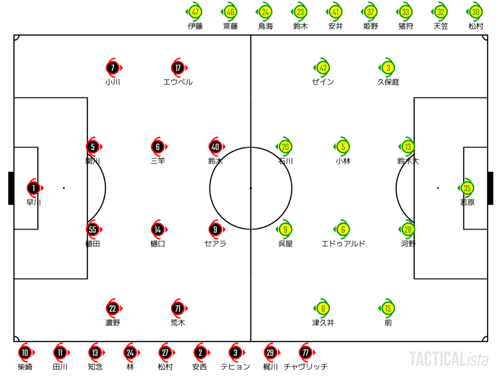 インサイドで起点を作り、アウトサイドの濃野のオーバーラップからセアラでゴールに向かう鹿島。しかしながら、細かなパスミスでリズムを失う場面も。縦への推進力も微妙で、いつもほどのシャープさを出せない場面も散見された。