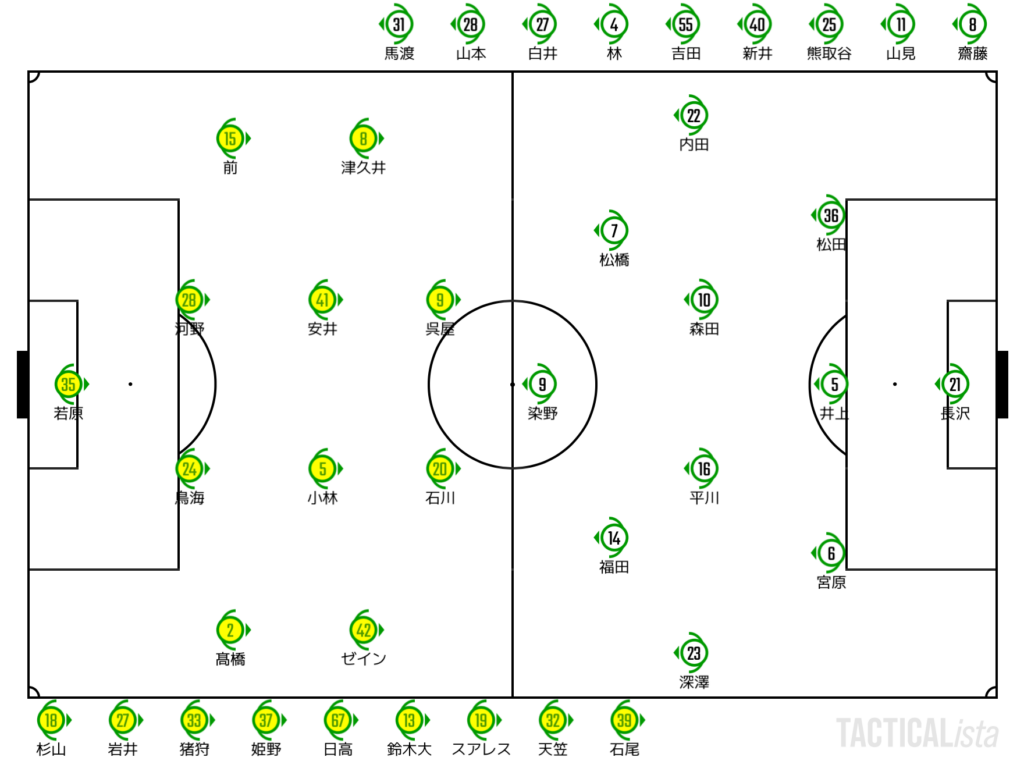 立ち上がりは東京Vが比較的おとなしい入り。5-4-1ベースのミドルブロックから受けるスタンスを取る。千葉は右の大外にいるイサカにボールをつけることで前進を試みる。