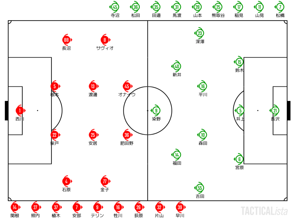 序盤から積極的にプレスに出ていくのは東京V。陣形が噛み合わないながらも前方にスライドすることで相手を捕まえにいく。浦和はサイドにボールを逃しながら陣地回復。金子のカウンターや降りるサヴィオを追い越す形から一気に進んでいく。敵陣まで入っていけばオナイウの空中戦の強さは頼りになる。