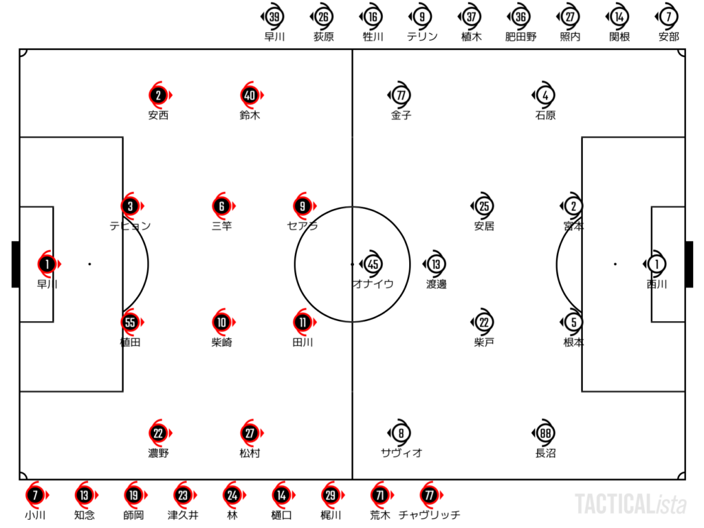 金子がセアラからボールを奪ってチャンスを作る場面もあったが、時間の経過とともに主導権は鹿島へ。2トップの関係性を崩さずにインサイドでの連携からシュートに持ち込むなど、これまでにあまり見られなかった形も見せる。さらにハイプレスから浦和を押し込み、流れを引き寄せていく。
