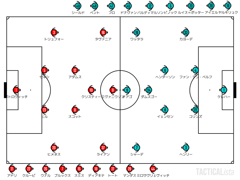 ワイドではWGが躍動。1on1を制することができるライアンとオフザボールで抜け出すタヴァニアの両翼から少しずつボックス内に迫っていく。しかしながら、ゴールをこじ開けることはできず。試合はスコアレスでハーフタイムを迎える。