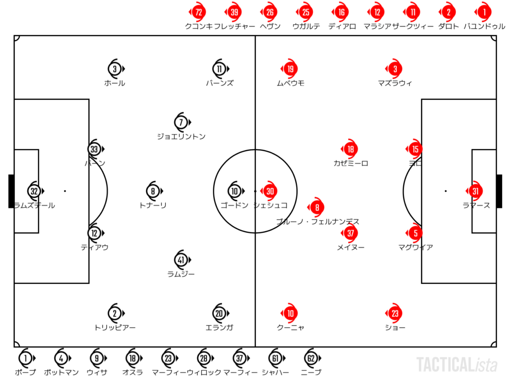 立ち上がりにいい入りをしたのは連敗を避けたいニューカッスル。幅を使いながらのポゼッションに対して、マンチェスター・ユナイテッドはやや受けに回る立ち上がりとなった。