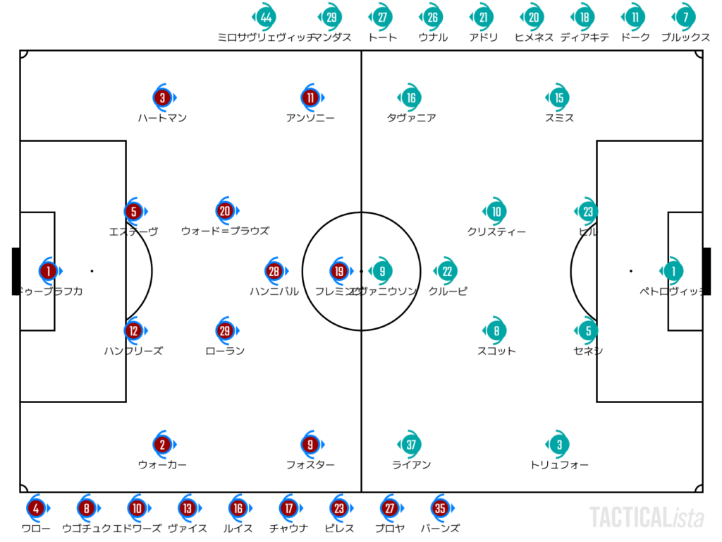 しかしながら、ボーンマスはこの状況はお手のもの。縦パスで空洞化している中盤を繋ぐと、早速エヴァニウソンが決定機を迎える。そちらがその気ならばという感じで非保持でも前にガンガン出ていくボーンマス。ハイプレスからバーンリーのショートパス主体のビルドアップを阻害していく。やはり要所での馬力はボーンマスが上であることを感じる序盤戦だった。