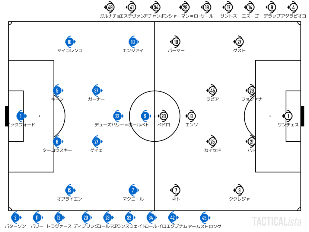 保持でもベトにボールを当ててのセカンド回収が機能するエバートン。保持でも非保持でもチェルシーを食うような試合運びを見せる。