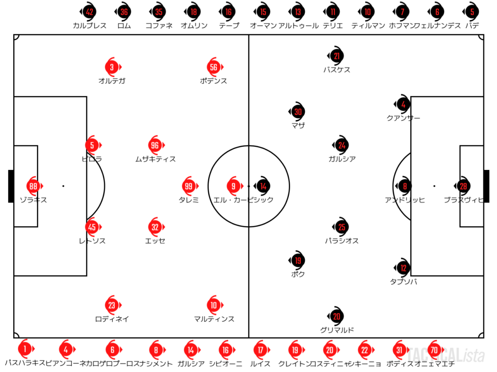後半もマルティンスの自在な形からゴールに迫るオリンピアコス。レバークーゼンは右サイドからクアンサーが抜け出すなど変化をつけていくが、少しプレスの圧に苦しんでいるように見えた。