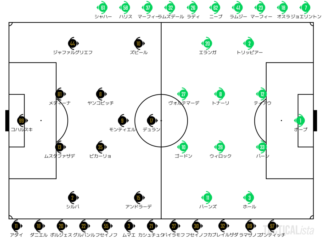 何とか試合を落ち着かせたいカラバフだが、ブロック守備を組んでも防衛することはできず。特にゴードンは手が全く付けられず。左サイドからの横パスでフリーになるとそこからのチャンスメイクでガンガンゴールに迫っていく。まるでこの90分ですべてを終わらせようという意気込みをもってこの試合に臨んでいるかのようだった。