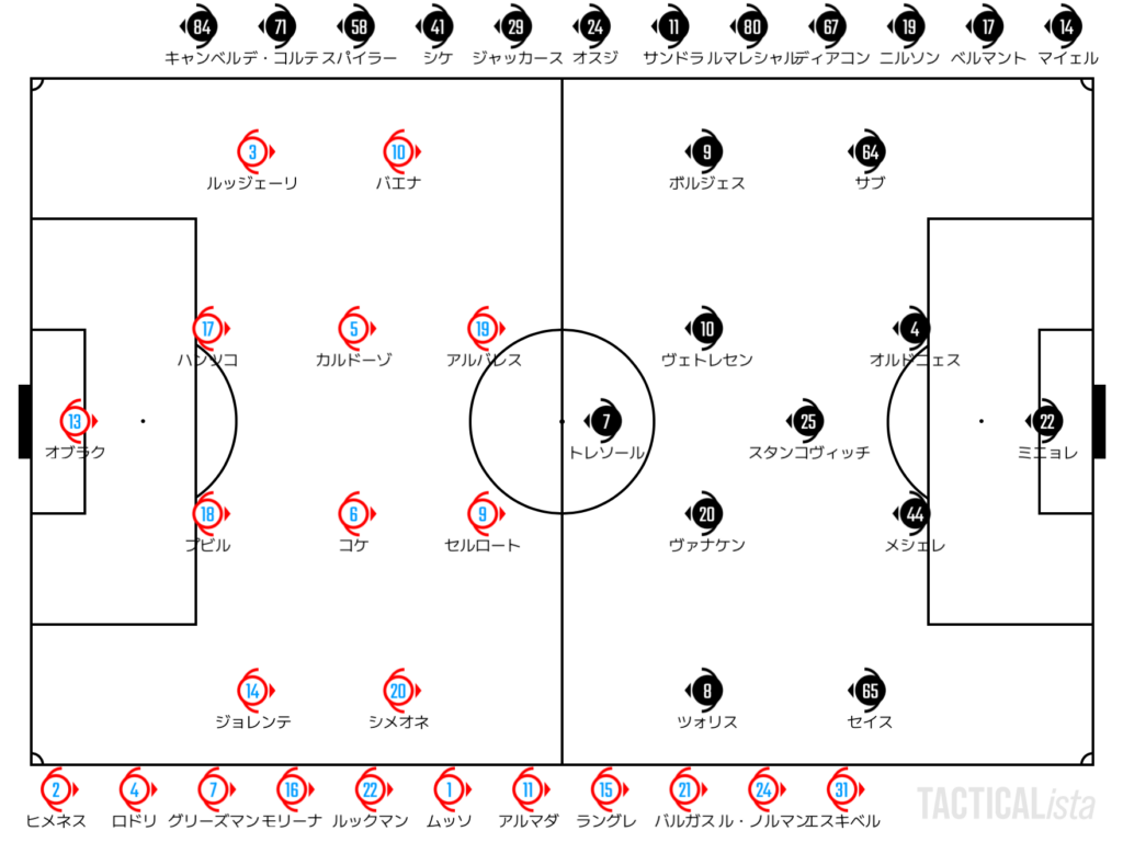 もちろん、1st legで存在感を見せたポゼッションも健在。ボールを動かしながら右の大外に張るボルジェスから勝負を仕掛けていく。