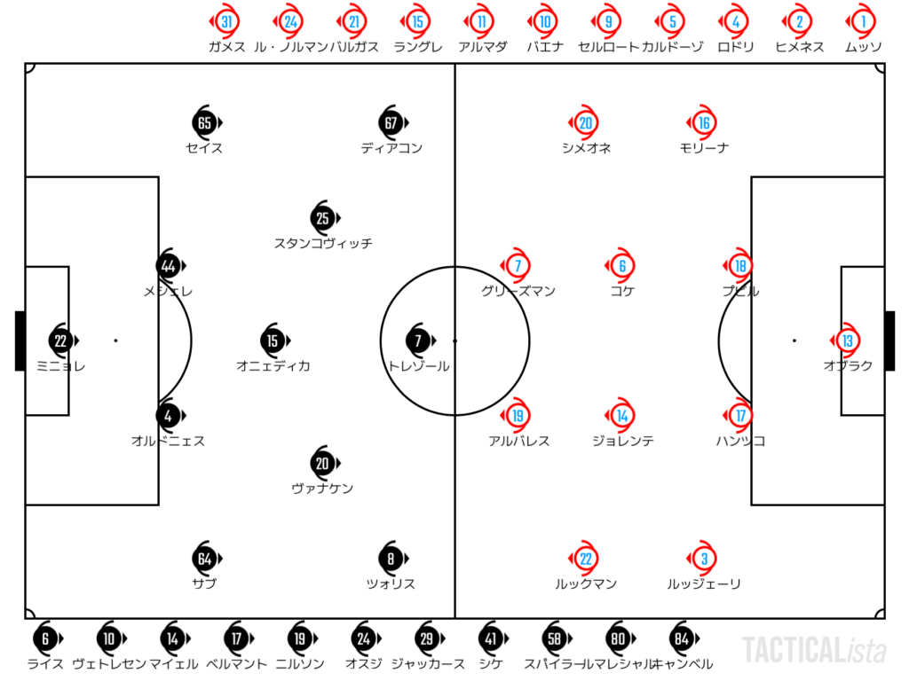 アトレティコは前線にロングボールをつけながら陣地回復。非保持においても少しずつラインを上げることにフォーカス。徐々に敵陣でのプレータイムを増やすと、セットプレーからルックマンが追加点。リードを広げてハーフタイムを迎える。