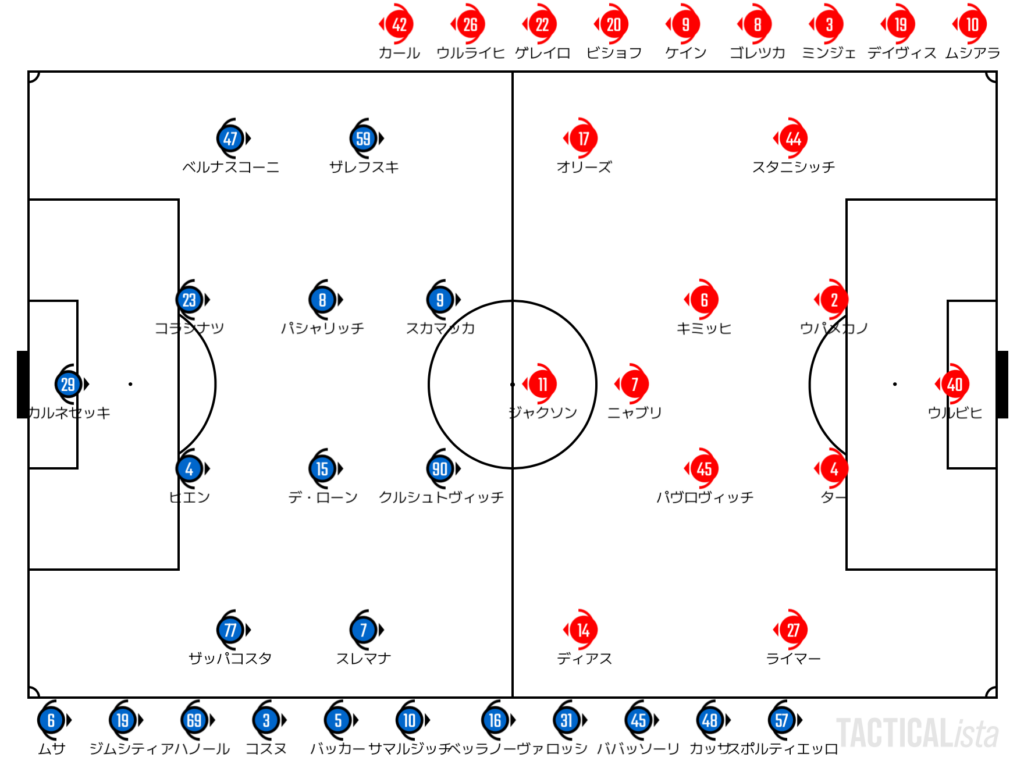 後半、3バックにシフトしたアタランタ。いつもの形に戻しつつクルシュドヴィッチやスレマナという前線のタレントを活かしながら反撃に出ていく。だが、バイエルンのきっちりとした保持が後半も試合を制圧する。着実に繋いでジャクソンが決めた4点目はリードをしているチームの余裕を感じるもの。