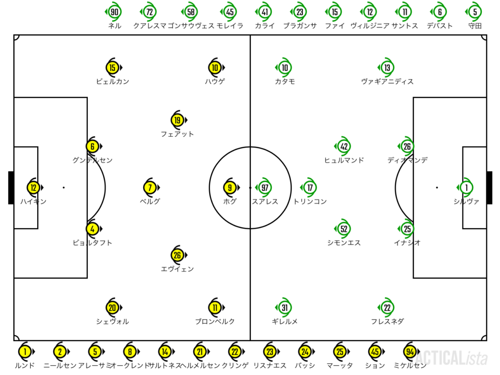 逆にカタモ、スアレスなどは前に残して背後を取るアクション。後方での数的優位の構築と奥行きを使う安全なアプローチからチャンスを伺う。
