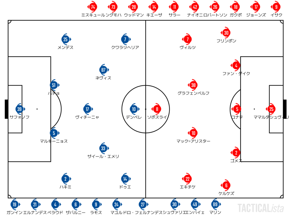 ハイプレスを再度起動するリバプールだが、パリは難なく剥がすことに成功。スピードアップして敵陣に入り、多くのチャンスを生み出す。取り消されたコナテのPKをはじめとして、リバプールは多くのピンチを凌ぐ展開となった。