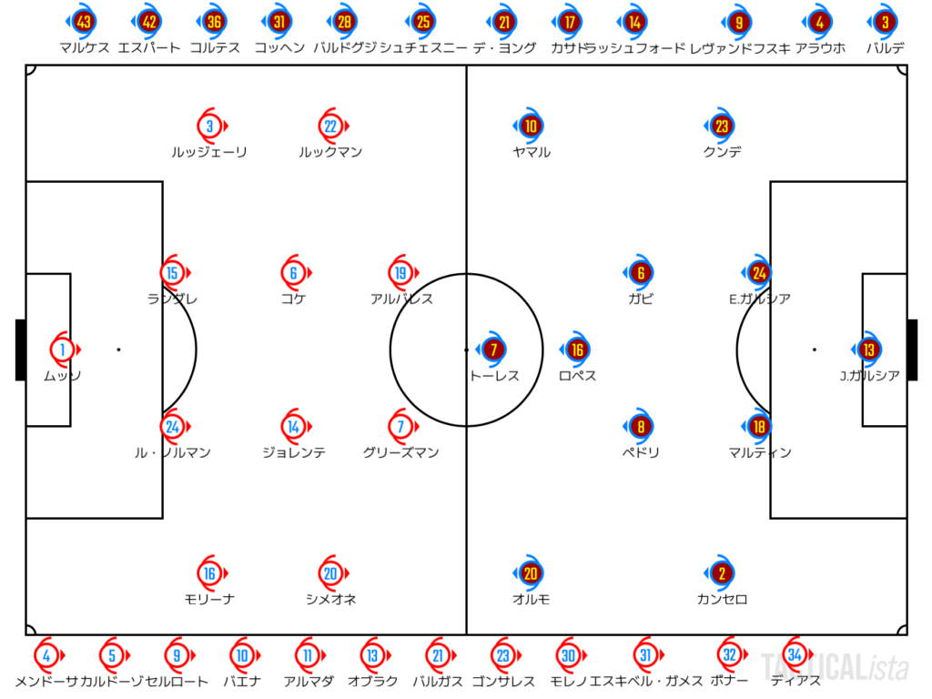 以降もヤマルを囮にしたラインブレイクからオルモが決定機を作るなど、主導権はバルセロナ。アトレティコは一度落ち着かせるために保持に回り、ゆったりとボールを動かす。前からのプレスに対しては、サイドに流れるグリーズマンを起点に反撃を模索。ルックマンのタメと組み合わせることで打開の糸口を探る。