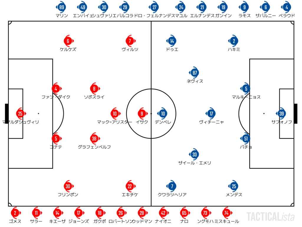 1st legは非保持5-4-1を見せたリバプールだが、今回は4-2-3-1をキープしたまま人を入れ替える形。エキティケを右のWGに置くことが一番の変化ということになるだろう。