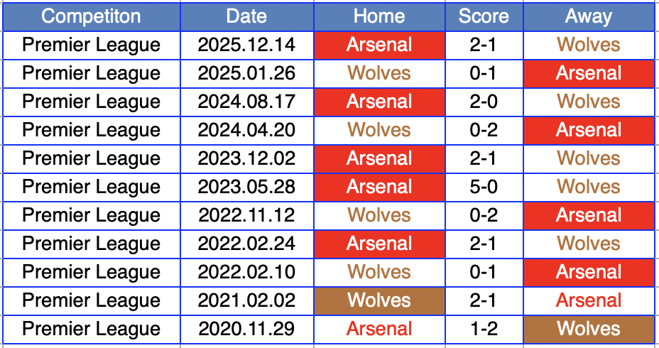 過去10回の対戦でウルブスの2勝、アーセナルの8勝。