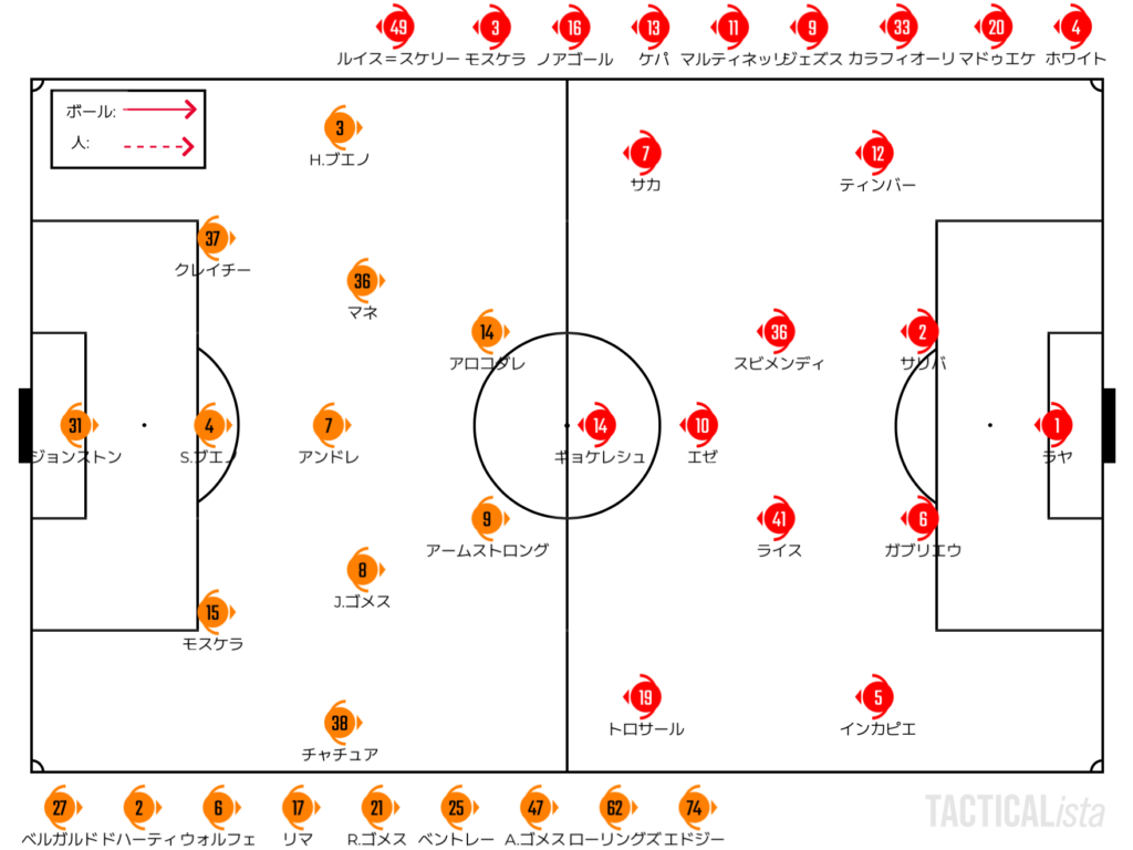ジェズスにちょっかいをかける方のモスケラは特にその傾向が強い。マリーシア的な挑発による狡猾さというよりは、シンプルに状況に対して適切なプレーをすることがうまくなく、その点でやりすぎてしまう選手というのがここまで見た感想である。よって、そうしたCB陣の判断の裁量が多くなる状況を作るのがアーセナルの活路になる。