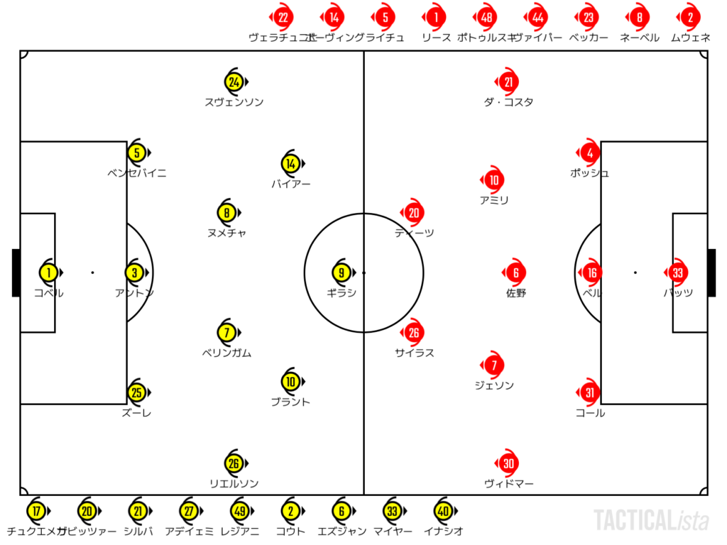 保持からまずはCHをフリーにしたいドルトムント。幅とライン間を併用しながらゴールに向かっていく。押し込むことができたドルトムントはセットプレーからあっさりと先制ゴール。ギラシが空中戦の強さを見せてドルトムントが早々にリードを奪う。