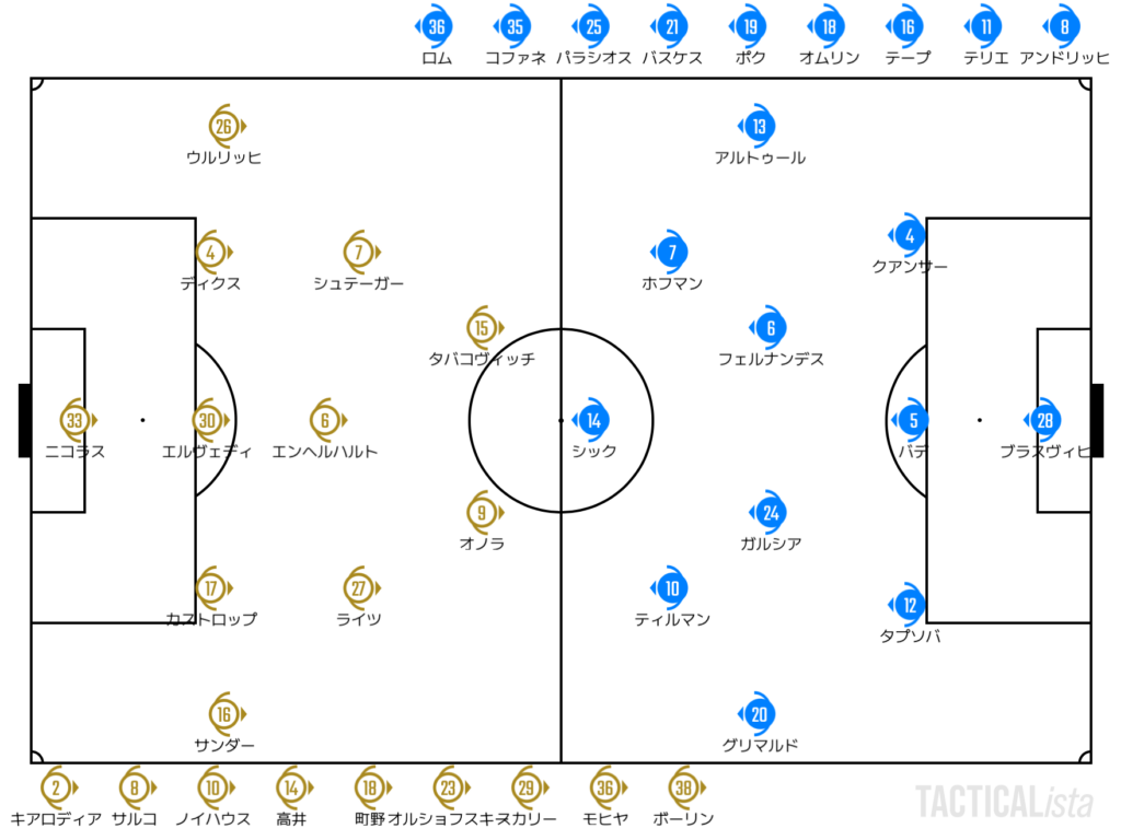 前プレスはかからない状態ではあったため、均衡した展開になっていたこの試合。先制点はプレスの成功から。ハイプレスを仕掛けたエンテンハルトが自らフィニッシャーに。グラードバッハが先制点をそのままゴールにつなげた。