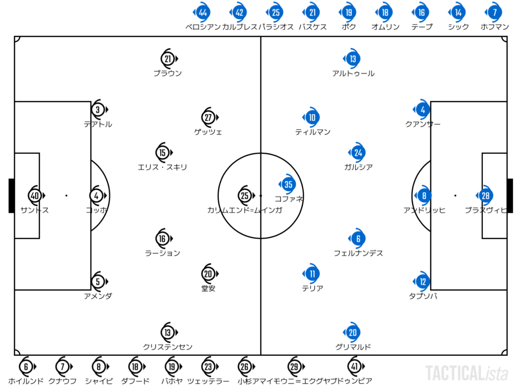 このグリマルドにはかなり苦戦したフランクフルト。2失点目では横断から正位置である左の大外の駆け上がりを許すと、ファーのコファネから遅れて入ってきたティルマンがゴール。リードを奪う。保持でもなかなかテンポを奪い返せず、失点して以降は厳しくなったフランクフルトだった。