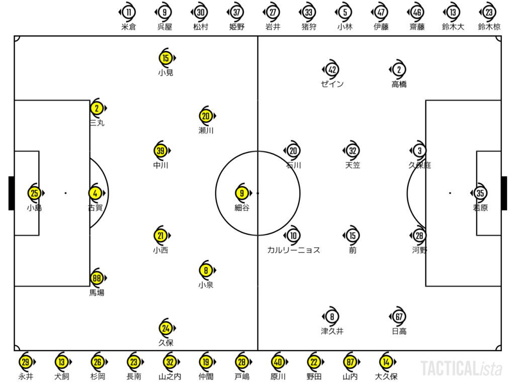 ゆったりとした保持では高橋がインサイドに絞る3-2-5にシフトするが、自陣でのパスワーークのミスから久保の決定機を誘発するなどあまり良いリズムを生み出すものではなかった。前半は特にどの手段でも前進に苦しんだ印象だった。