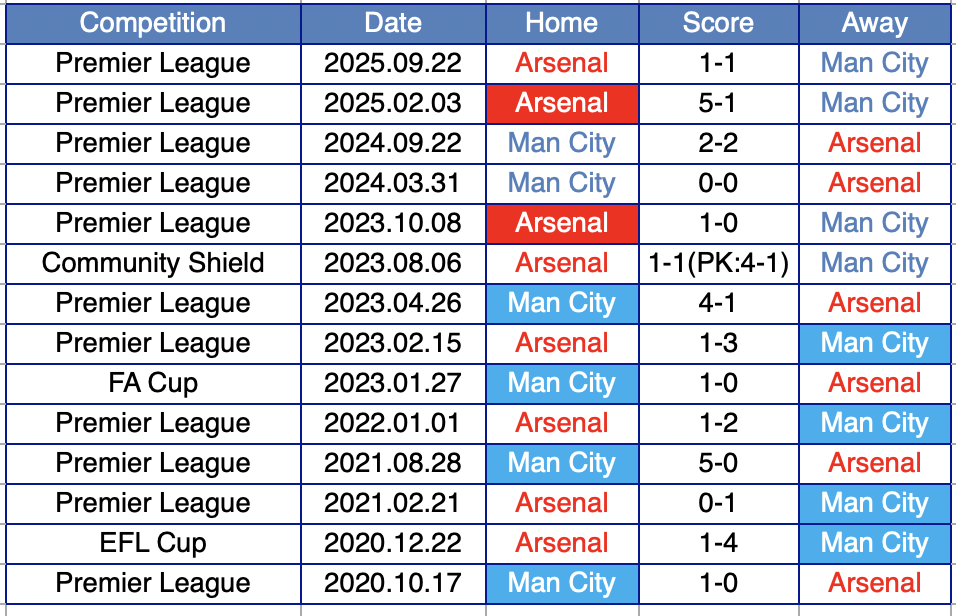 過去5シーズンの対戦でマンチェスター・シティの8勝、アーセナルの2勝、引き分けが4つ。