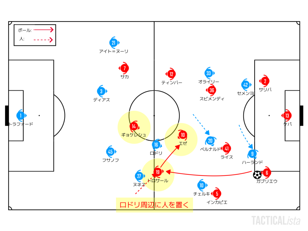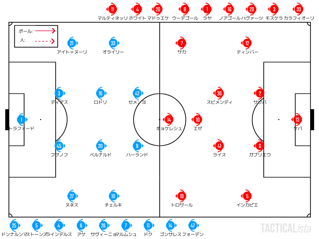 逆にギョケレシュ、エゼといった直近の流れを大事にするのであれば、左のWGはウーデゴールロールができるトロサールが適している。いずれにしてもベルナルドが前に出てきた分のスペースを活用することはシティ攻略の第一歩。