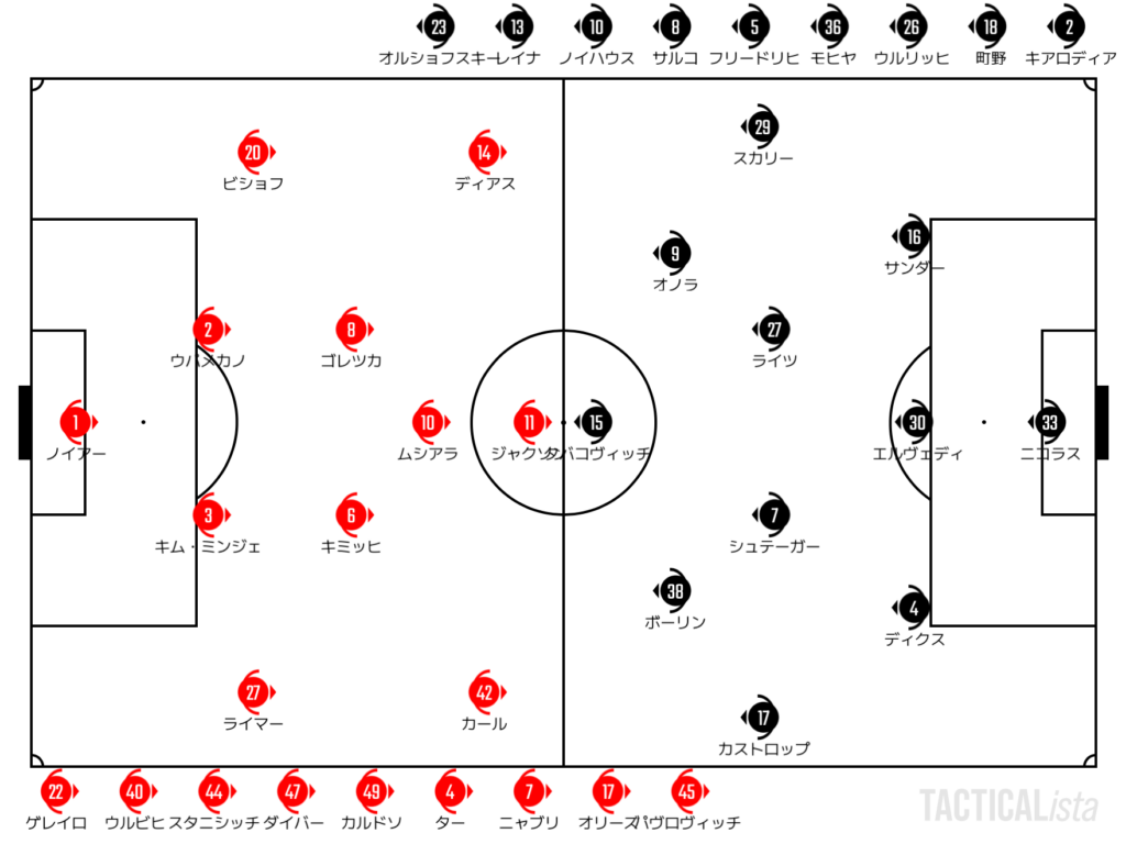 BAY:31′ ディアス, 45+1′ ライマー, 57′(PK) ムシアラ, 79′ ジャクソン