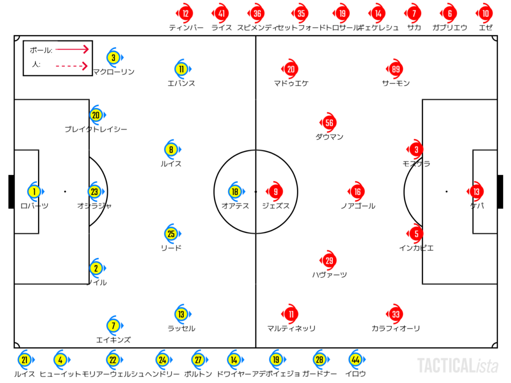 守備においてはオアテスへのロングボールにどのように対応するかが非常に重要。全体的に左に流れ気味のプレーが多いので、アーセナルの右サイドの守備ユニットは機能性が問われるかもしれない。ブライトン戦では悔しい交代となったモスケラや出場が期待されるサーモンにとっては腕の見せ所である。