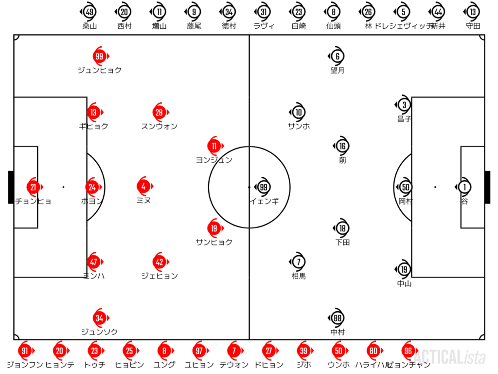まずボールを動かしていくのはホームの江原。GKを絡めた3バック化でボールを動かしていく。町田はハイプレスには行かずに自重。イェンギは中盤を守備の基準点として、前に出ていくよりも中盤を管理する役割を担う。江原はそんな町田に対して中央に突き刺すためのスペースを探りながらボールを動かしていく。