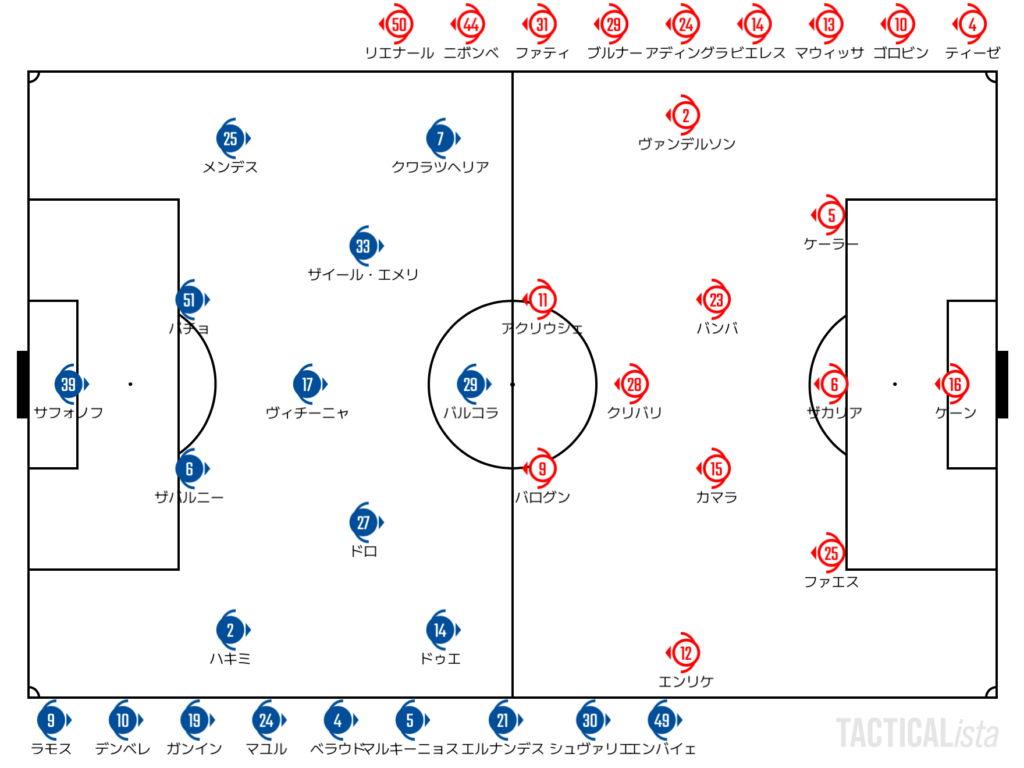 パリは3枚替えでギアを上げる。投入から10分ほどでハキミの横断を起点にバルコラがゴールを奪い、1点差に詰め寄る。