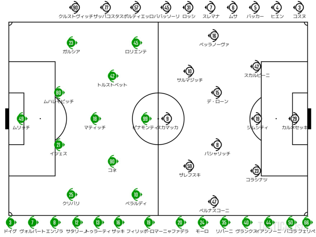 後半も展開は同じ。アタランタがボールを持ちながらサッスオーロの壊しどころを探っていく流れとなった。3枚交代を敢行したアタランタはCFに推進力のあるクルシュトヴィッチに加えて、左にスレマナを投入。サイドと中央のアタッカーを入れ替える。