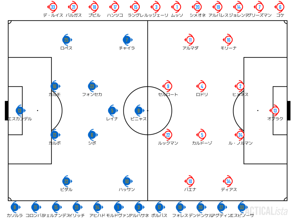 オビエドはカウンターではピニャスの推進力を生かして縦に速い攻撃を繰り出すことができていたし、成功体験のあるハイプレスも後半になって勢いが衰えることはなかった。エネルギッシュにアトレティコと渡り合うことができていたと言って差し支えないだろう。終盤に登場したカソルラも横断からばっちりとチャンスメイクをしていた。