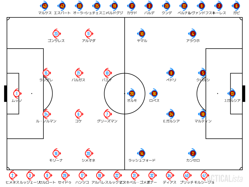 バルセロナは列を押し上げることでグリーズマン周辺にギャップを作り、ライン間での前進を狙う。オルモやフェルミン・ロペスが中盤で受け、左はラッシュフォードが反転、右はヤマルがワンタッチで背後を取るなど、サイドとインサイドの両面から攻略を図る。